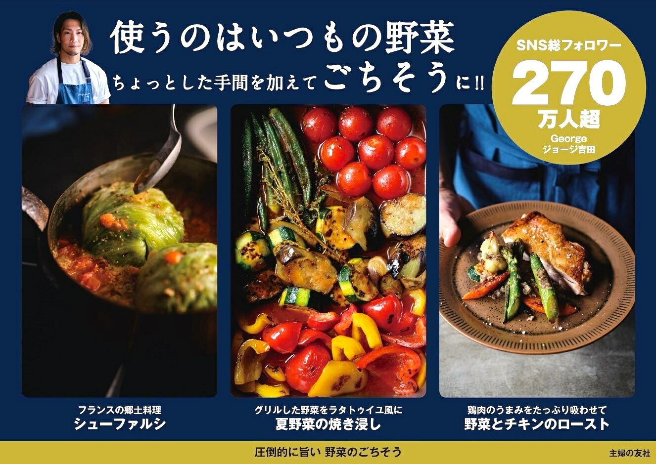 YouTubeチャンネル登録者数は130万人以上。フレンチシェフとして二つ星レストランなどで研鑽を積んできたGeorge流の技とアイデアで、身近な野菜が主役級のごちそうに変わります。メインディッシュになる食べごたえとインパクトがある「ステーキ」、野菜の味わいを丸ごと堪能できる「煮込み」や「スープ」、新感覚なおいしさに出会える「パスタ」や「リゾット」など。野菜は単なる「副菜」と思うことなかれ。ちょっとした下処理の工夫、旨みの引き出し方、火入れのコツによって、ごちそう感のあるおいしさが楽しめます。玉ねぎ、にんじん、トマト、じゃがいも、なす、白菜など、いつもの野菜が極上のひと皿になる、野菜料理の新たな魅力に出会える1冊です。