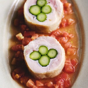 鶏肉に薄切りの豚肉を重ねてアスパラを巻き、味の層を作ります。お店のような華やぐ一皿に。