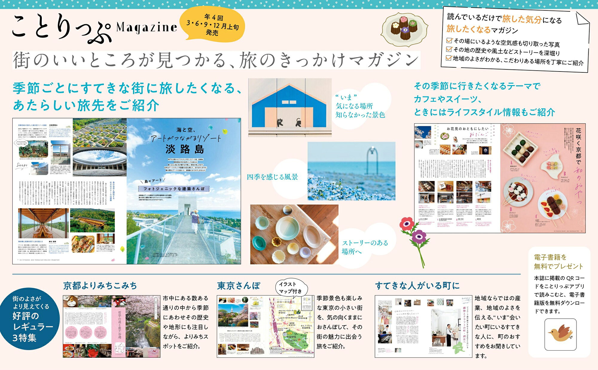 "街のいいところをみつける、旅のきっかけマガジン"をコンセプトに、人気ガイドブックシリーズの「ことりっぷ」が、季節ごとにすてきな街へ旅したくなる幅広いテーマで、あたらしい旅先をお届けします。すてきな街、食、歴史、文化、その街で暮らす人をたずねたり、旅にまつわる映画、音楽、インタビュー、レシピなどもご紹介。旅に出かけたくなるだけでなく、読むだけで旅した気分になれる、新しいライフスタイルにもつながる、旅のきっかけマガジンです。