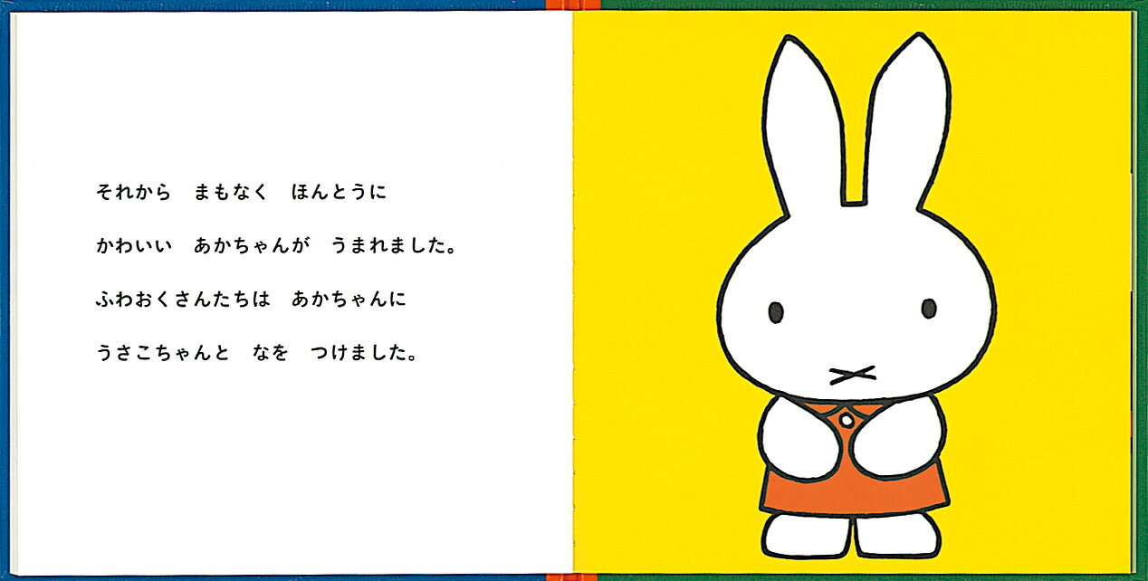 ふたりは赤ちゃんに「うさこちゃん」という名前をつけます。太った牛ににわとり、たくさんの動物がうさこちゃんを見にやってきて、ふたりにお祝いの言葉を贈ります。