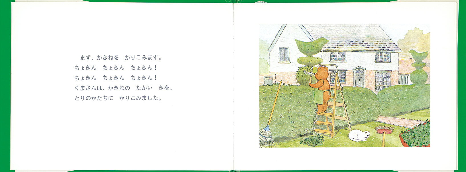 朝になると植木屋のくまさんはエプロンをかけ、手押し車に植木ばさみとほうきを積みこんででかけます。