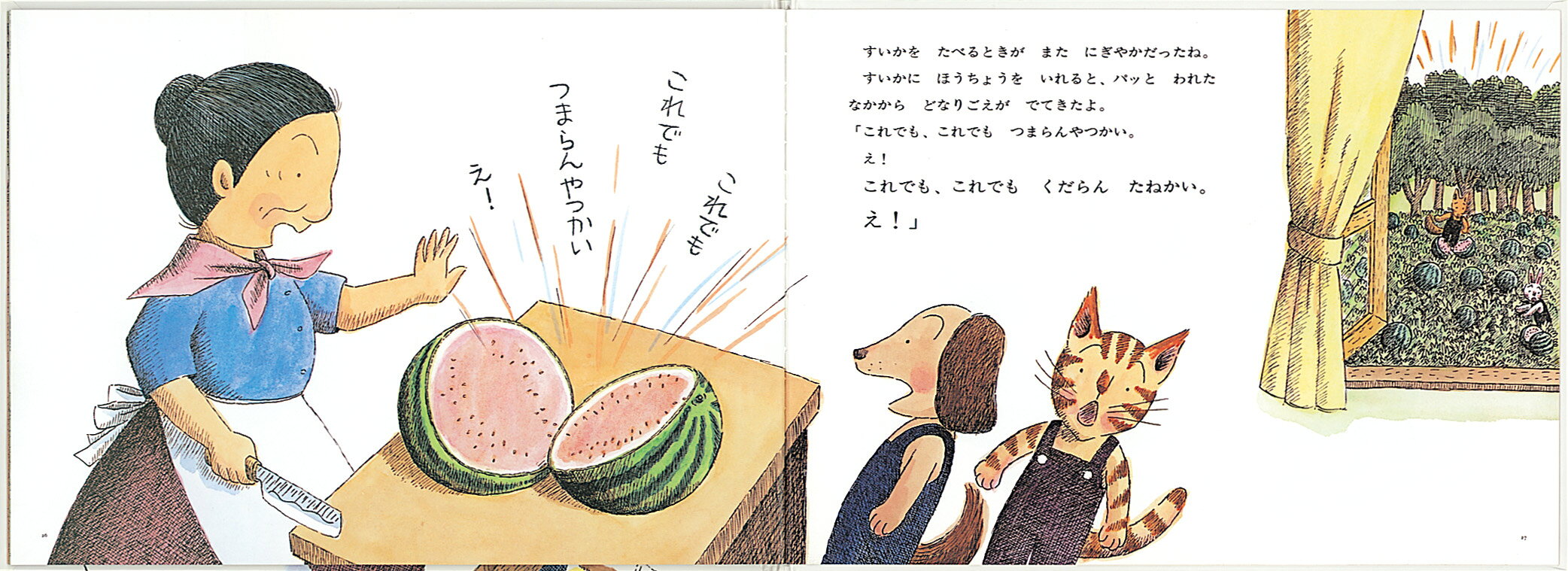 そんなたねを「大きくおなり」と、ばばばあちゃんが叱りつけたものだから、さあ大変。悔しくがって勢いよく育ったすいかが、ぐんぐんつるを伸ばし始めたのです!