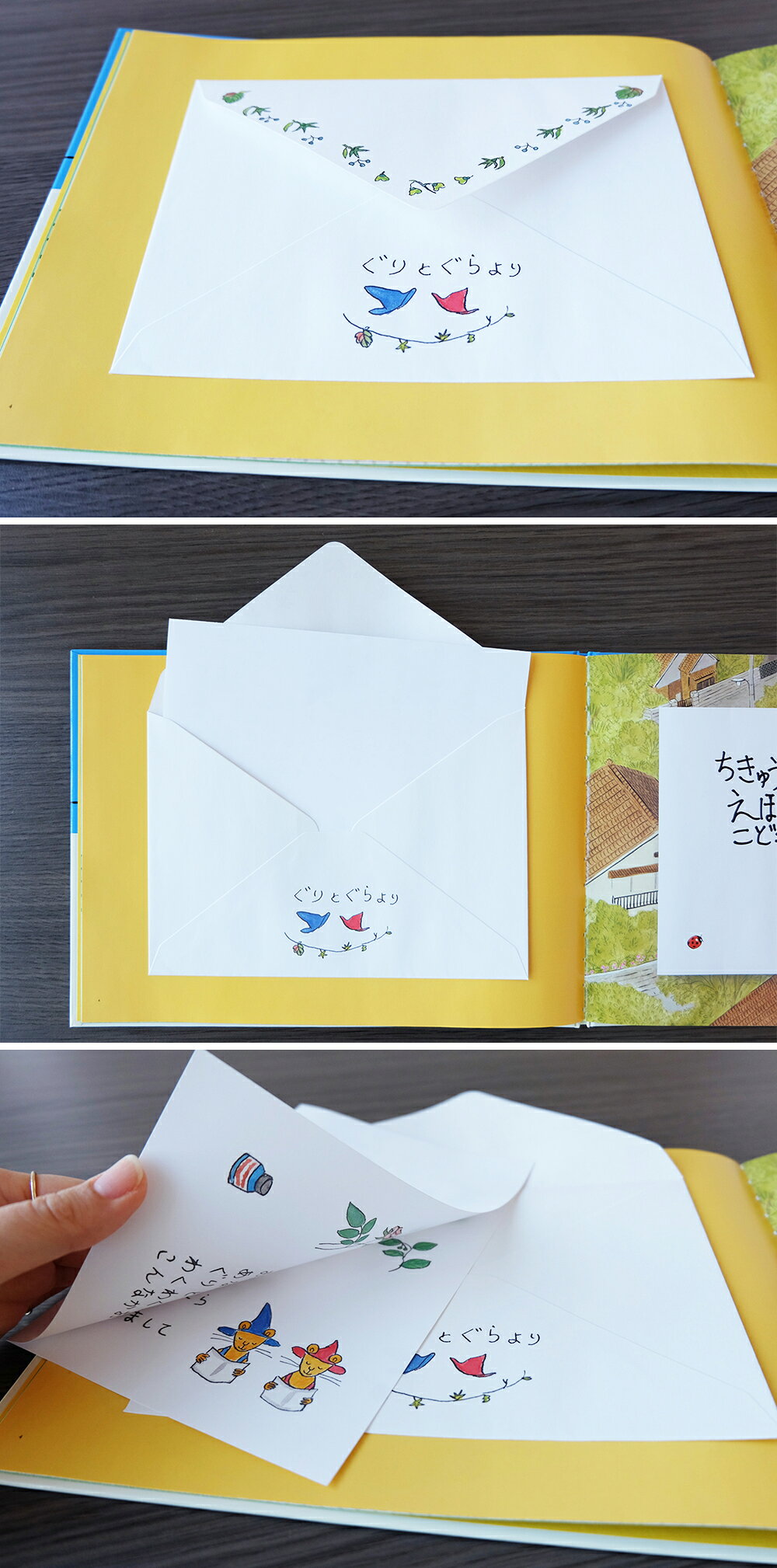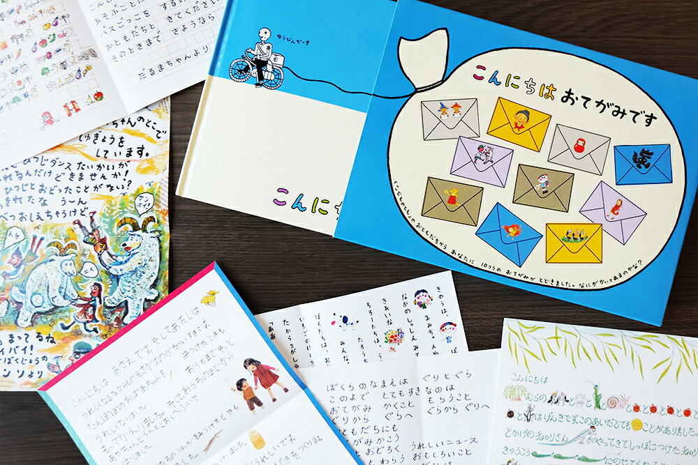 「ぐりとぐら」「だるまちゃん」「やなぎむらのむしたち」「あさえ」「たろう」「おおかみ」(『やっぱりおおかみ』)「エンソくん」からの10通の手紙が、10個の本物の封筒に入っています。
