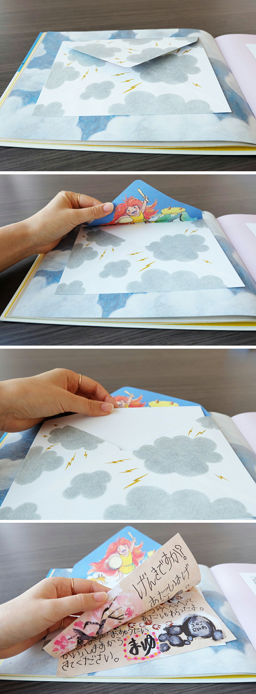 雲から稲光が出ている封筒は、誰からの手紙でしょうか。中を開けてみると……。元気いっぱい、やまんばのむすめ まゆ からでした!