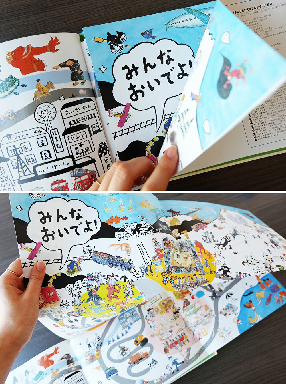 最後まで読むと。特大ページに「こどものとも」のたくさんの主人公たちがひしめいて遊んでいます。