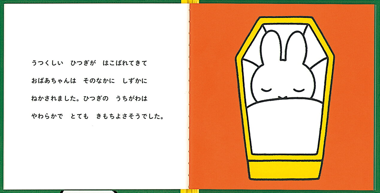 うさこちゃんの大好きなおばあちゃんが、亡くなりました。家で亡くなったおばあちゃんを悲しみながら見送る周りの人や、お墓のことなど、身近な人の死が、この本には描かれています。ブルーナさんの死の描写は、簡潔ですが、国や文化が違っても変わらない大事な部分をしっかり描いているため、幼い子どもたちに、きちんと伝わる内容になっています。