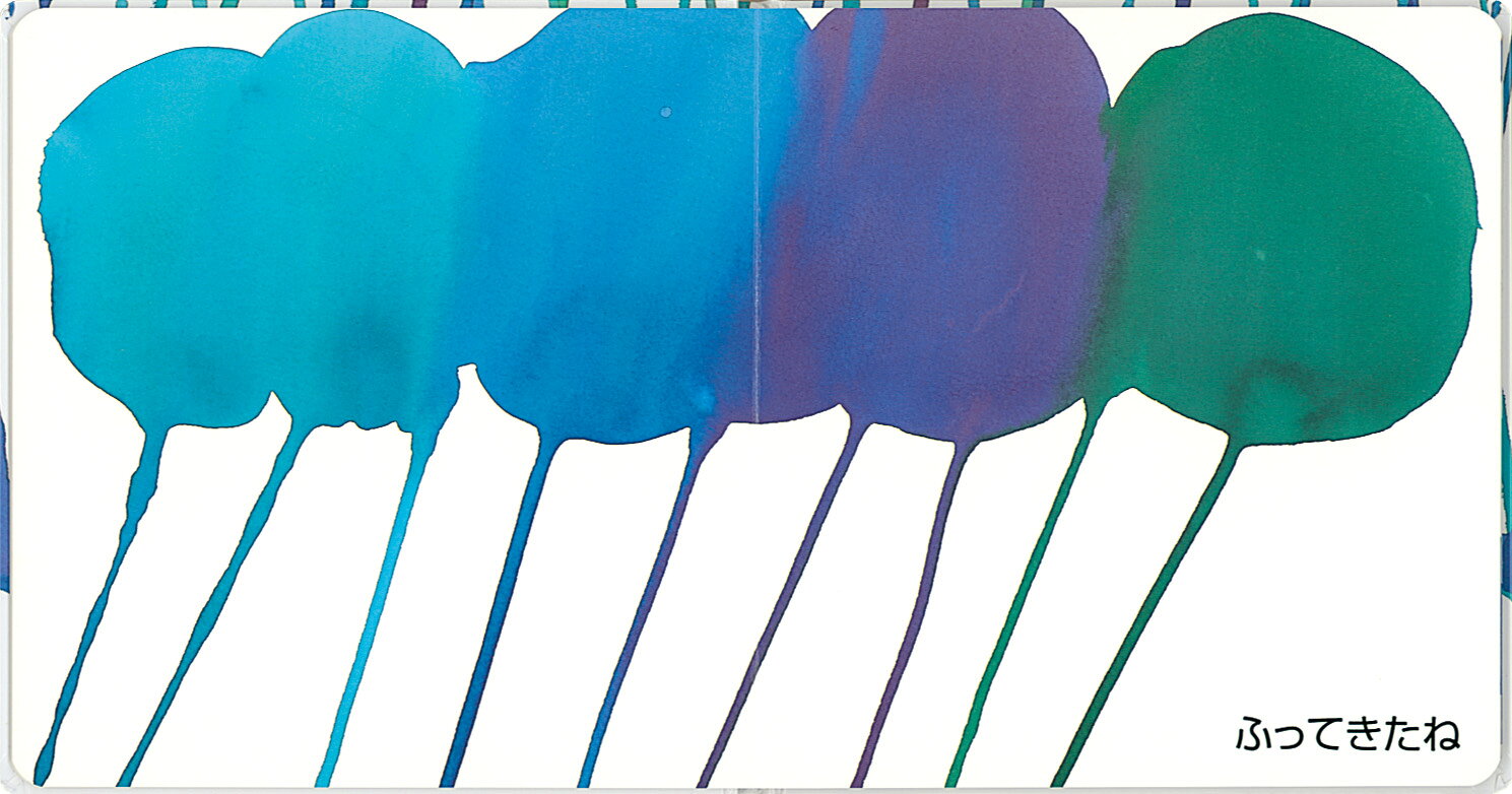 暗い空から、ぽつり。あかいしずく。ぽつり。あおいしずく。そして、むらさき、ぐんじょう、エメラルドの雨がざあざあざあざあ。なないろの雨がふりしきり、やがてももいろの光がおりてきて……。紙に、色とりどりのカラーインクと水を流し込むという独特の技法を編み出したU.G.サトー氏。空と雨と、光と時の流れを、グラフィカルに描きます。