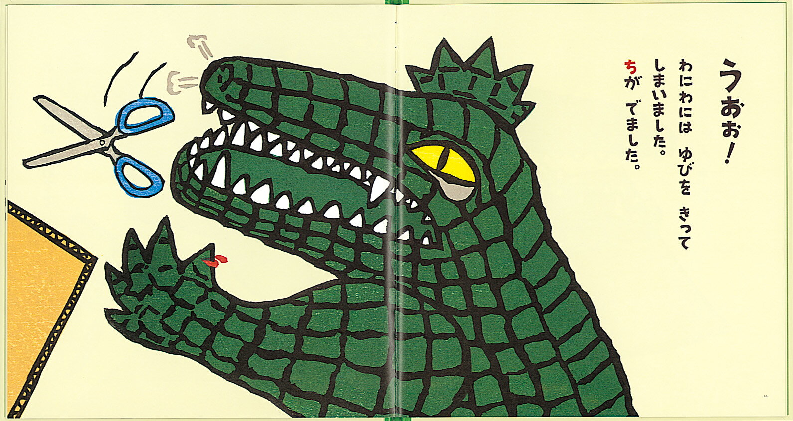 のときハサミで指の先をほんの少し切ってしまいました。「うおぉ!」わにわにはあわてて薬を塗り、包帯をぐるぐる巻きました。