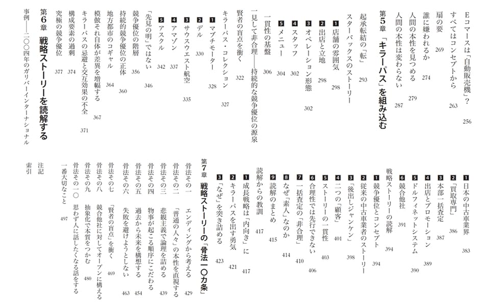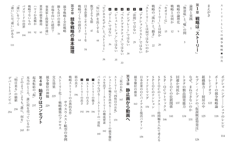 第1章 戦略は「ストーリー」/第2章 競争戦略の基本論理/第3章 静止画から動画へ/第4章 始まりはコンセプト/第5章 「キラーパス」を組み込む/第6章 戦略ストーリーを読解する/第7章 戦略ストーリーの「骨法一〇カ条」