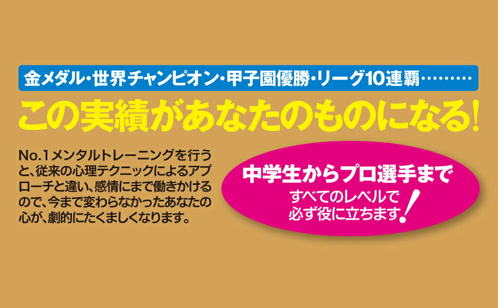 金メダル・世界チャンピオン・甲子園優勝・リーグ10連覇…この実績があなたのものになる!No.1メンタルトレーニングを行うと、従来の心理テクニックによるアプローチと違い、感情にまで働きかけるので、今まで変わらなかったあなたの心が、劇的にたくましくなります。中学生からプロ選手まですべてのレベルで必ず役に立ちます。