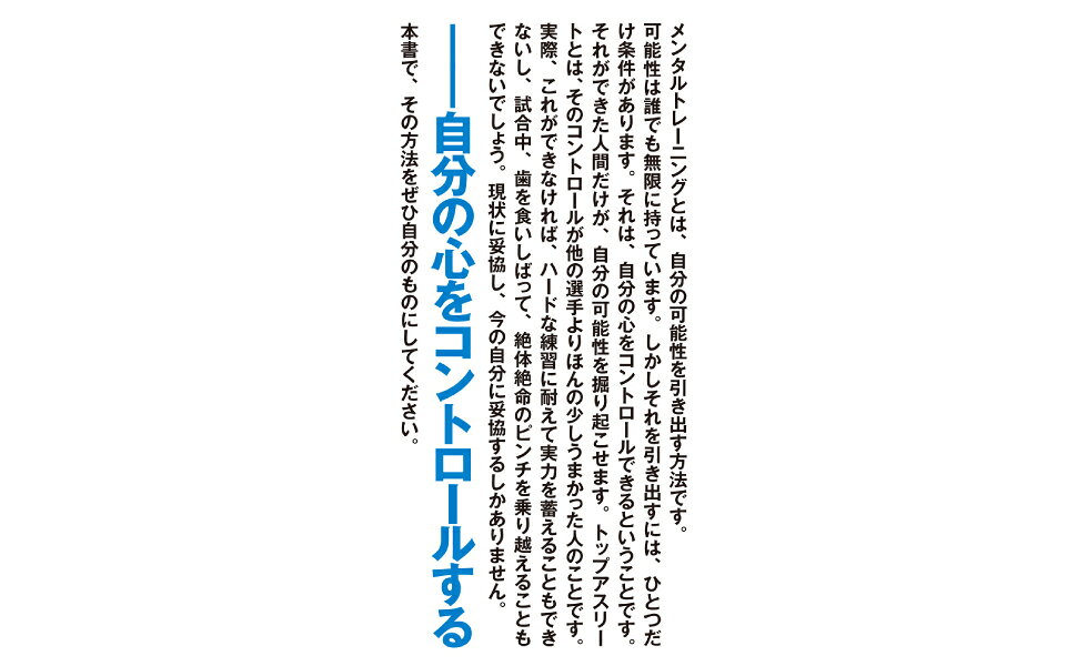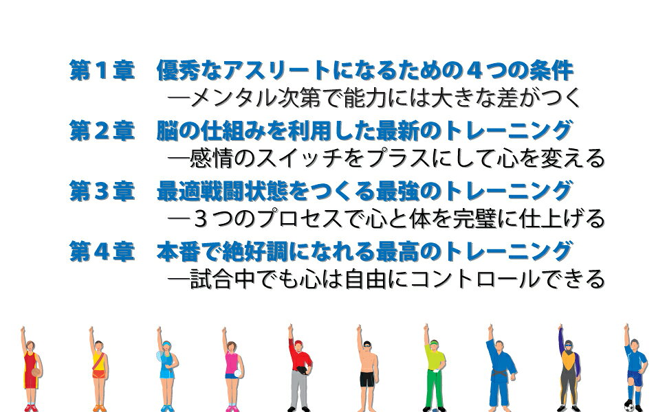 第1章 優秀なアスリートになるための4つの条件ーメンタル次第で能力には大きな差がつく(優秀な選手と一般的な選手との違い 能力には保有能力と発揮能力がある/優秀なアスリートになる条件1 ワクワクできる目標を設定する/優秀なアスリートになる条件2 詰める能力を高いレベルにする/優秀なアスリートになる条件3 クリアリング能力を身につける/優秀なアスリートになる条件4 素直な負けず嫌いという特性を持つ)/第2章 脳の仕組みを利用した最新のトレーニングー感情のスイッチをプラスにして心を変える(勝負を左右する脳の仕組み1 上手に脳を使う人がスポーツでも成功する/勝負を左右する脳の仕組み2 脳には感情を切り替えるスイッチがある/メンタルトレーニングの基本ステップ1 プラスダー多を脳に入力する/メンタルトレーニングの基本ステップ2 3つの道具を使って心をコントロールする)/第3章 最適戦闘状態をつくる最強のトレーニングー3つのプロセスで心と体を完璧に仕上げる(三気法の基本的な考え方1 メンタルを変えるとゾーン状態になれる/三気法の基本的な考え方2 3つのプロセスが最適戦闘状態をつくる/最強のメンタルトレーニングのプロセス1 三気法の土台「気を蓄える」/最強のメンタルトレーニングのプロセス2 三気法の要「気を練る」/最強のメンタルトレーニングのプロセス3 三気法の仕上げ「気を締める」)/第4章 本番で絶好調になれる最高のトレーニングー試合中でも心は自由にコントロールできる(気を制する者が試合を制する理由 本番ではメンタルの差が勝敗を分ける/本番前のトレーニング ビトウィンゲーム1 前の結果は忘れて絶好調で試合にのぞむ/本番前のトレーニング ビトウィンゲーム2 準備を万全にして最高のプレーをする/本番でのトレーニング ビトウィンプレーー試合中の心を思い通りにする/日々の練習におけるトレーニングーメンタルへの意識が能力を伸ばす)