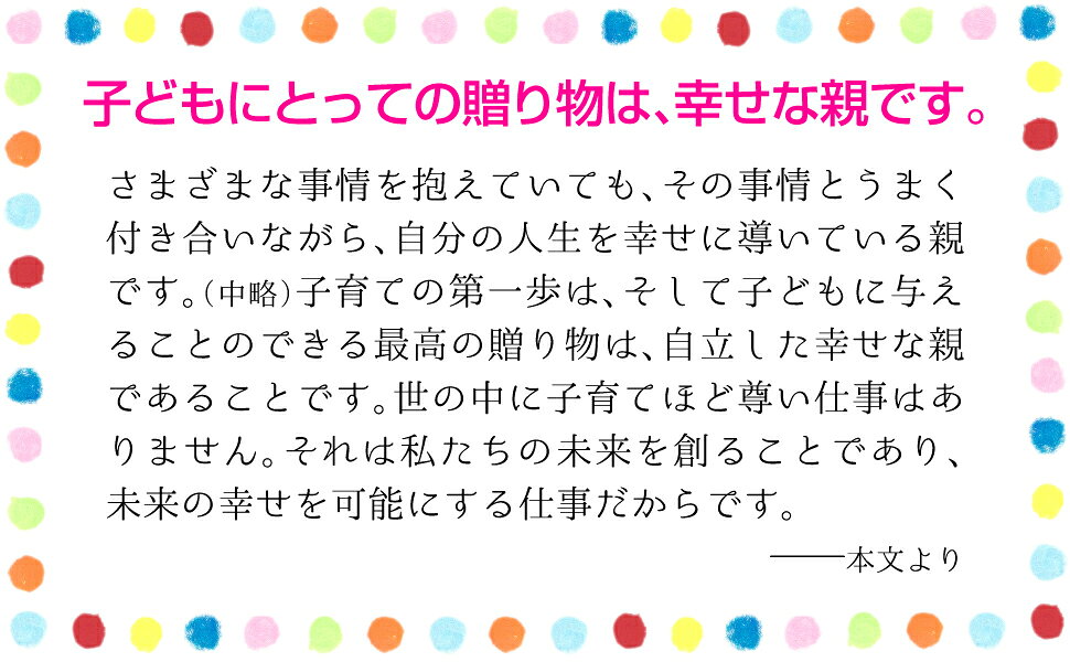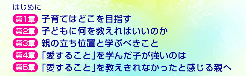 第1章 子育てはどこを目指す/第2章 子どもに何を教えればいいのか/第3章 親の立ち位置と学ぶべきこと/第4章 「愛すること」を学んだ子が強いのは/第5章 「愛すること」を教えきれなかったと感じる親へ/第6章 「責任」は生き方の質を決める/第7章 「責任」を教えきれなかったと感じる親へ/第8章 「人の役に立つ喜び」は生きることの充足感/第9章 親の自立