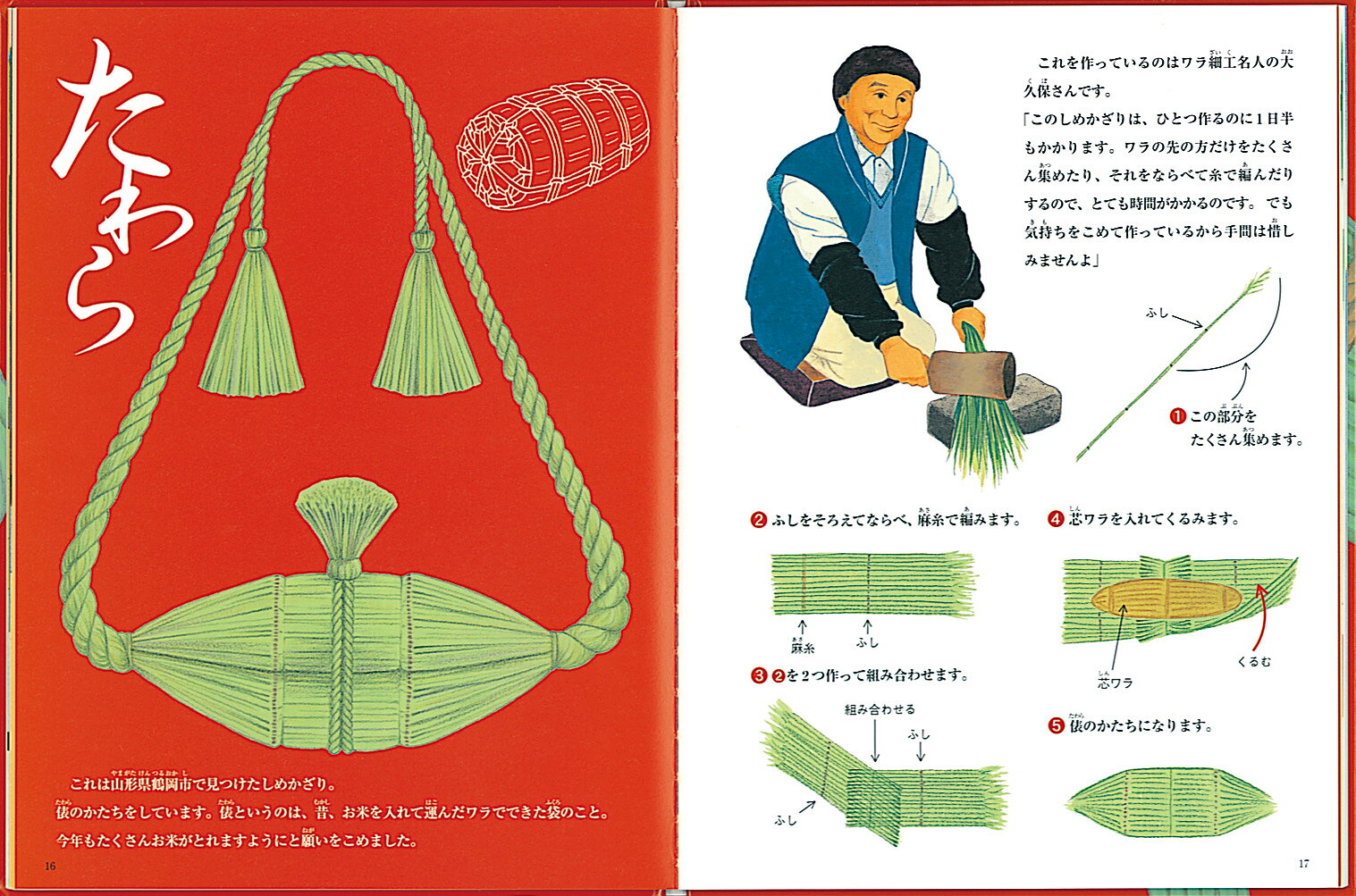 お正月、家々の玄関に飾られた "しめかざり"を、みなさんもきっと見たことがあるでしょう。どんな形だったか、覚えていますか? 地域地域でちがうのはもちろん、作り手や飾る場所によってもしめかさりの形はさまざまで、日本全国には鶴や亀、蛇、馬、柄杓や俵など、驚くほどいろいろな形のしめかざりがあります。基本的にワラだけで作られるしめかざりの造形の美しさを見ながら、そこに込められた人々の想いをたどります。内容紹介(情報提供:絵本ナビ)