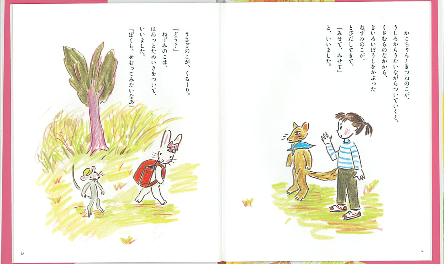 「もうすぐ もうすぐ、一ねんせい。みてよ、ぴかぴかランドセル」と、うたいながら歩いていくと、きつねの子がやってきて、「ぼくもせおってみたいなあ」とつぶやきます。