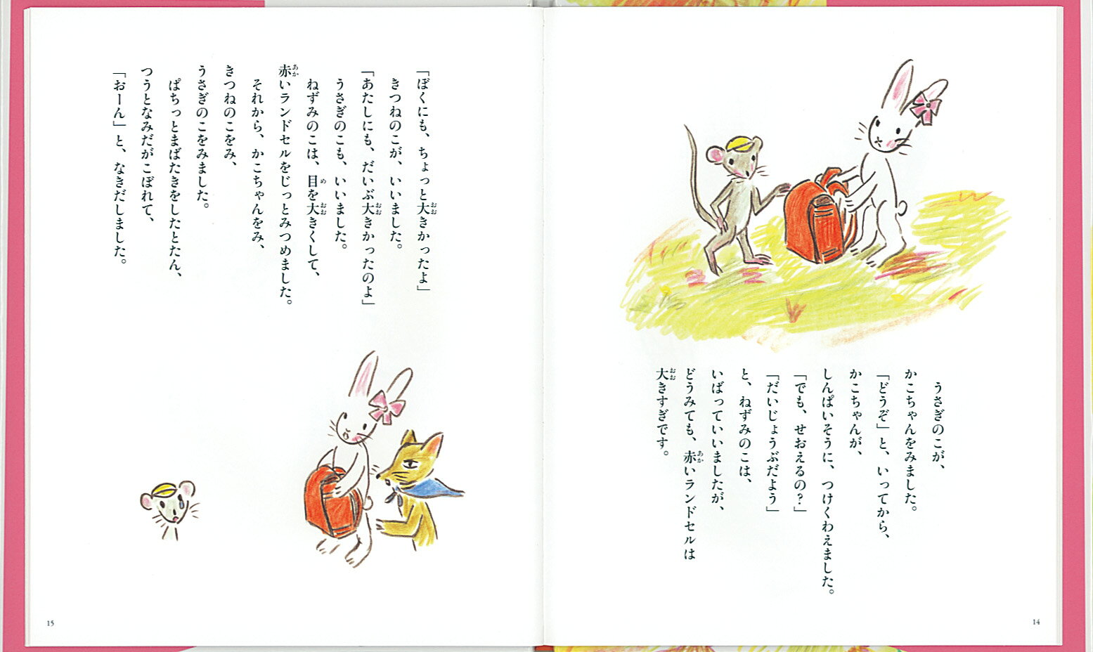 こんどはうさぎの子にランドセルをせおわせてやり、三人でうたいながら歩いていくと、ねずみの子がやってきて、「ぼくも、せおってみたいなあ」とつぶやきます。