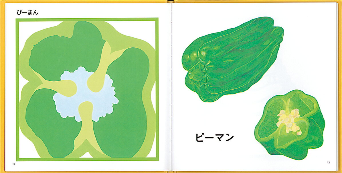 | ふしぎな形、一体これは何でしょう? 次のページを開くと答えが……。身のまわりにある野菜の断面(おなか)が美しい絵で次々と登場する楽しい絵本。 |