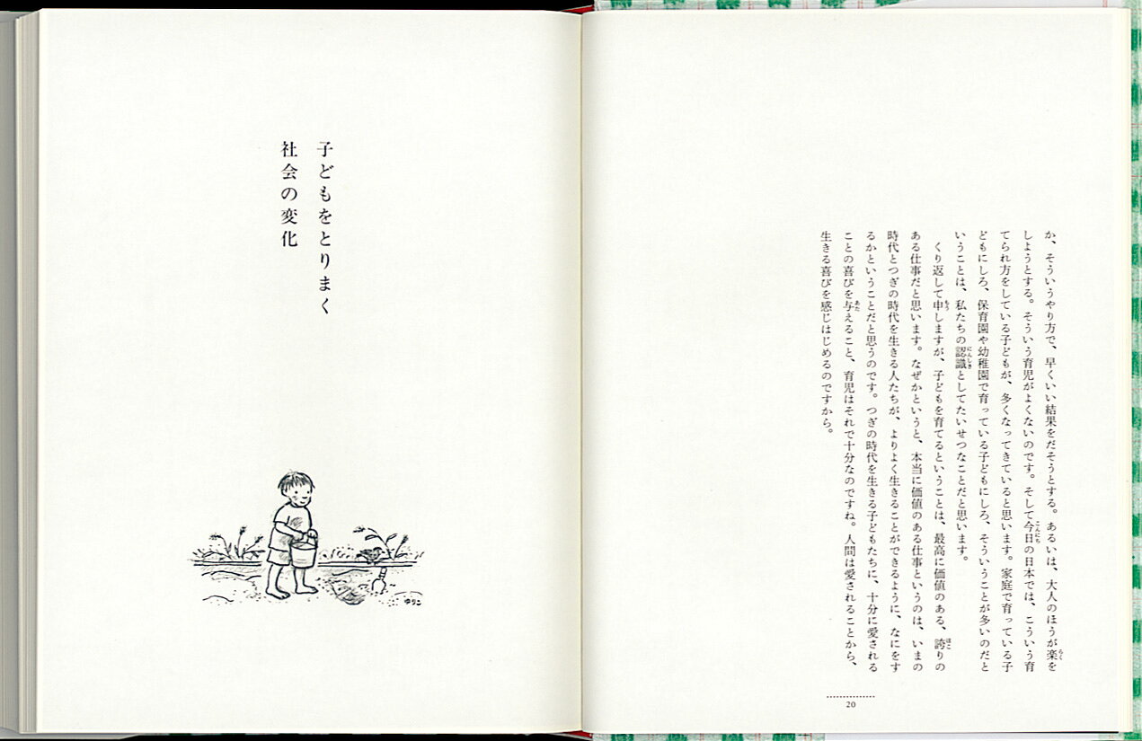 乳幼児期は人格の基礎をつくるとき/子どもをとりまく社会の変化/人と育ち合う育児/こんな気持ちで子育てを/生命との出会い/乳児期に人を信頼できると子どもは順調に育つ/子どもの望んだことを満たしてあげる/幼児期は自立へのステップの時期/しつけはくり返し教えること、そして待つこと/思いやりは身近な人とともに育つ/子ども同士の遊びのなかで生まれるもの/友達と学び合う時期/思春期は自分さがしの時期/豊かな社会がもたらしたもの/保母さん、幼稚園の先生へ/お母さんへ、お父さんへ