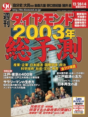 【特集】2003年総予測産業・企業/日本経済/国際関係/国内政治/科学技術/社会・文化・教育 全111項目SPECIAL 変われるのか日本経済「長期停滞」を解剖する2002年/2003年 小泉改革の採点表不良債権最終処理/財政改革/雇用対策/特殊法人改革産業・企業interview 今こそ「無血革命」が必要 年功序列の打破を図れ マネックス証券社長/松本大予測 総合電機/銀行/ゼネコン/流通/自動車/生保/総合商社/化学/鉄鋼注目の対決 鉄道vs飛行機/六本木vs汐留/液晶vsPDP商品・サービス予測 ホテル/IP電話/第3世代携帯電話/温泉施設/ネット家電/燃料電池車/タカラ/新札発行日本経済interview 先行き不安解消すれば消費・投資は回復する 東京大学教授/吉川洋予測 景気/金利/物価/株価/財政赤字/地価/為替/倒産/米国経済国際関係interview 国として毅然と対応すべき 内閣官房参与/中山恭子予測 北朝鮮/MAP 世界の紛争は続くか/中国経済/中国の新指導体制/ユーロ圏経済SPECIAL サラリーマンの生き方interview 「大企業で働くこと」を支持する理由 東京大学社会科学研究所助教授/玄田有史予測 メンタルヘルスの危機/働き方の多様化/中年ガテン/内定学生の20年後SPECIAL 江戸・東京の400年interview 江戸の経済を活性化させた 市民の知恵、商人の哲学 作家/山本一力MAP 江戸・東京の進化と落差/比較考証 江戸三大改革と小泉改革国内政治予測 小泉政権/政界再編/MAP 全国知事選interview 市長室をガラス張りにする 尼崎市長/白井文ダイヤモンドZAi PRESENTS すご腕アナリストたちからの福袋 お楽しみ銘柄BEST20科学技術interview 地球温暖化対策 国立環境研究所社会環境システム研究領域長/森田恒幸予測 「体にいい」ブーム/動物由来感染症/人工生物/燃料電池/宇宙開発/オープンソースソフト/科学技術立国 中国社会・文化・教育talk with 父親・学校のこれから 小児科医/毛利子来/元リクルート フェロー/藤原和博予測 日韓教育格差/J-POP/映画/阪神タイガース/サッカー/日本人大リーガー/ベストセラーinterview 借金、暴力、嘘つき… 歪んだ"夢"がダメ男を生む 漫画家/倉田真由美lecture 日本はアジアと協調すべきだ アムステルダム大学教授/カレル・ヴァン・ウォルフレンthesis 日本的な独創力が再生へのカギ 作家/関岡英之座談会「民権宣言」特別編 停滞する小泉改革の突破口 [写真左から]元経済企画庁長官/田中秀征/立教大学社会学部教授/齋藤精一郎/北海道大学高等法政教育研究センター長/山口二郎INDUSTRY REPORT 産業レポート東京電力の原発全基停止へ 国策に疑問を呈する福島県佐藤栄佐久(福島県知事)「新しい原子力時代に入った今エネルギー政策を再考すべし」インタビュー 佐久間昇二(WOWOW会長兼社長)社長任期は来年6月まで 営業強化で飛躍の基盤作るインタビュー ジョン・メンザー(ウオルマート インターナショナル プレジデント兼CEO)西友400店舗を3〜5年で 世界レベルに引き上げるドキュメント 会社再建(7)福岡を燃えさせた男・高塚猛の軌跡シリーズ 数字で会社を見る 【パイオニア】社運賭けるPDP投資に 在庫圧縮で費用を捻出新・永田町の暗闘 鈴木棟一熊谷グループ離党で露呈 民主党分裂の火種残した代表選の知られざる内幕続・田中康夫と浅田彰の憂国呆談(8) 今、必要なリーダーシップ第5回 週刊ダイヤモンド「自分史」大賞発表 [写真左から]太平洋セメント相談役/諸井虔/青山学院大学教授/野口悠紀雄/日本経済研究センター顧問/金森久雄優秀作品賞受賞作 その1「老いても受ける 老いても受かる」 遠藤信(68歳/神奈川県横浜市)連載データ・フォーカス 呉軍華山崎元の個人投資塾 山崎元「超」整理日記 野口悠紀雄最新科学を読み解く 東嶋和子オピニオン縦横無尽 櫻井よしこ歴史の交差点 本村凌二OFF BUSINESS男の逸品/課長推薦この料理/マイゴルフ素顔の役員車とっておきの話 下野康史今週の一冊 北村行伸エコノミスト読書日記 横溝雅夫ブティック 鴨下信一井狩春男のこれは売れる!This WEEK〔12/23〜1/5〕世界のエクセレントホテルニッポン鳥瞰(37)