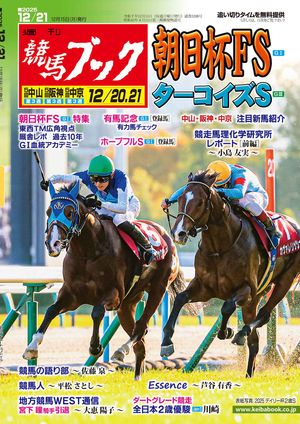 ◇登録◇朝日杯FS、ターコイズステークスほか◆成績◆阪神ジュベナイルF、中日新聞杯、カペラステークスほか朝日杯フューチュリティSG1、ターコイズSG3 朝日杯FSにはデイリー杯2歳Sのアドマイヤクワッズ、京王杯2歳Sのダイヤモンドノット、サウジアラビアロイヤルCのエコロアルバ、新潟2歳Sのリアライズシリウスらが揃う。2歳の頂点を目指す戦いを東西TM広角視点、厩舎レポ、過去10年、G1血統アカデミーで徹底推理。牝馬限定のターコイズSにはボンドガール、ウンブライル、ホウオウラスカーズ、カピリナらが出走予定。 ディセンバーS、ベテルギウスS、コールドムーンS、タンザナイトS、ポインセチアS、クリスマスローズS、ヤングジョッキーズシリーズファイナルラウンド中京など3場の特別レース検討。有馬記念登録馬。ホープフルS登録馬。 中山・阪神注目新馬紹介。 競走馬理化学研究所レポート・前編(小島友実)。 競馬の語り部(佐藤泉)。 競馬人(平松さとし)。 地方競馬WEST通信〜宮下瞳騎手引退(大恵陽子)。 ダートグレード競走〜全日本2歳優駿Jpn1(川崎)。